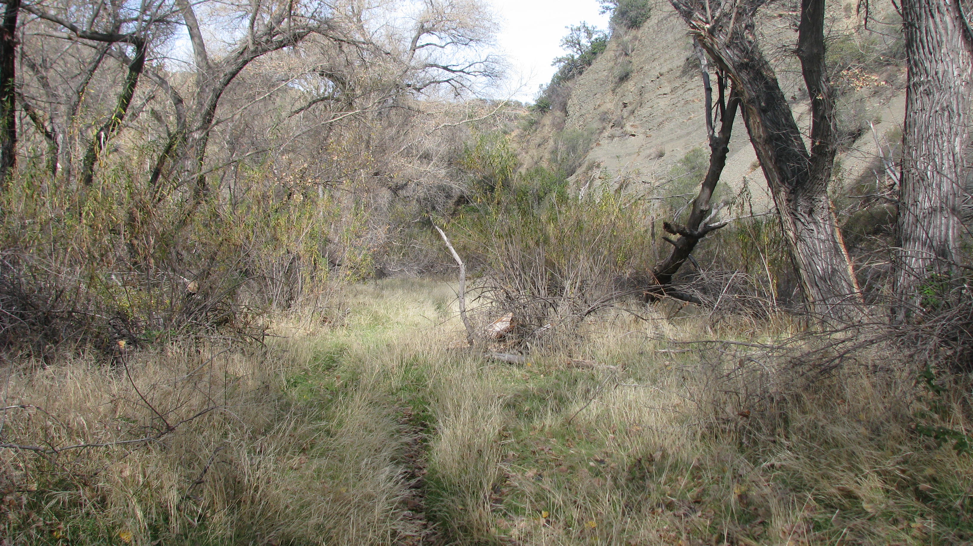 The trail continues to the Agua Caliente Debris dam, which prior to the Zaca fire had a fairly nice swimhole at its base, particularly in the hot months of summer. It is now silted up. Above the dam the scenery transitions as it threads its way through the Cottonwoods that fill the basin created by the dam. This time around the trail was carpeted with Cottonwood leaves and had a fairly magical feel, as few people tend to venture beyond the hot springs. It was also surprisingly easy to follow the trail through this section this time around. (In those times when trail is not as clear, the secret I’ve found to not getting lost is to know that you’re essentially in a basin and to your right is the hillside “wall” that forms this side of the basin (see photo below). At the point where this “wall” basically meets the creek the trail becomes distinct again and can be refound)