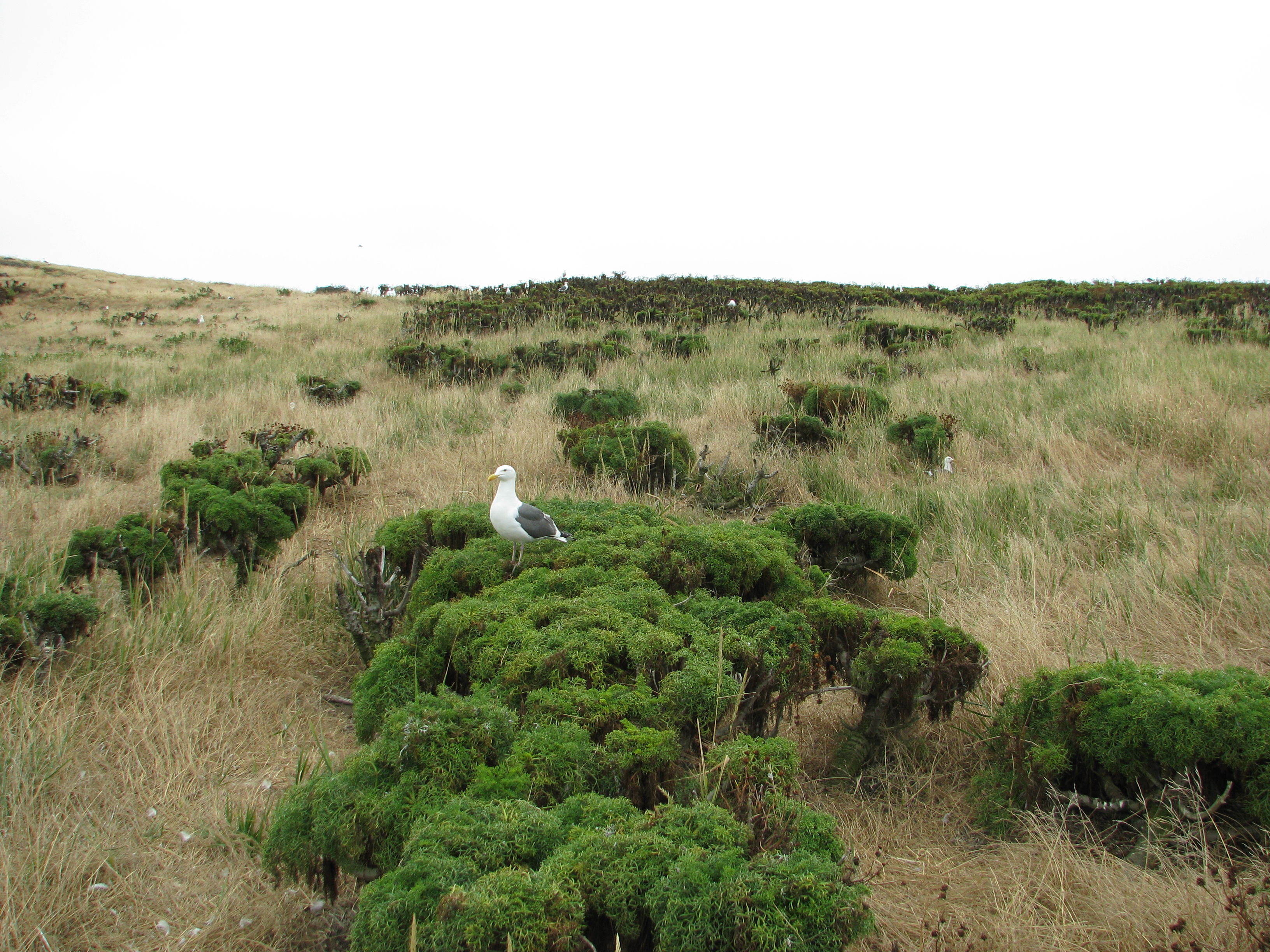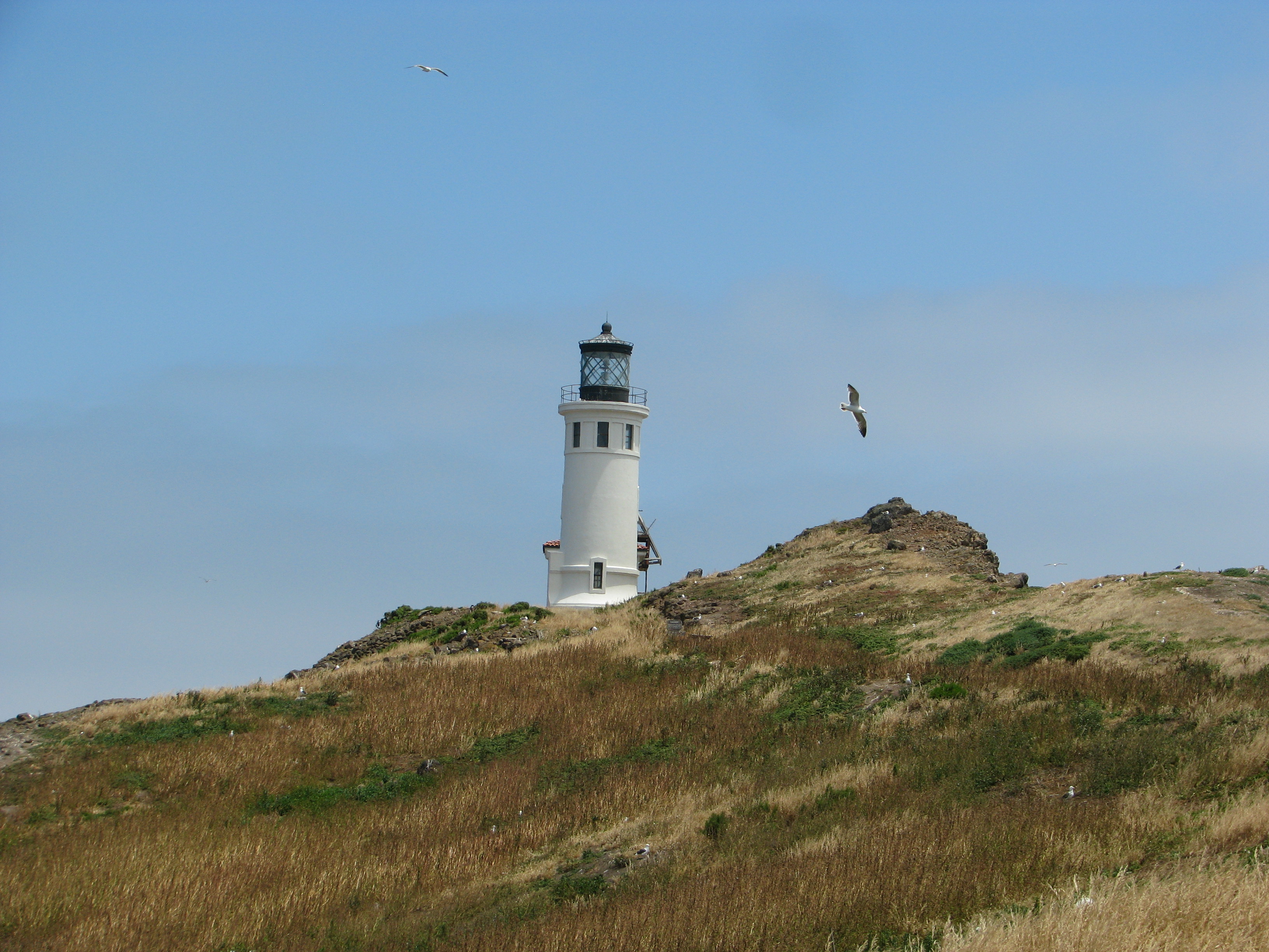 From the landing cove, it’s about a quarter mile to the Visitor Center. From there the trail makes a sort of figure eight with an extra spur trail towards the lighthouse, giving one an opportunity to see most of the island. The campground is near the middle of the island where the figure eight crosses. Probably the first thing you’ll notice this time of year is the sea gulls nesting all over the island. Earlier this year, the Western Gulls found mates and built nests and are now tending to their eggs, some of which are just starting to hatch. The hatchlings have the same green with dark spots coloring as the eggs. It is okay to walk around the island, but please stay on the trails and remember that the birds were here first. The hike from the Visitor Center around the island passes Pinniped Point along the south shore where one can see sea lions sunning themselves down on the beach. At the half-mile mark one arrives at the campground. From here the trail continues west and loops out towards Inspiration Point. Along the way you’ll pass a Chumash midden, recognizable by its broken shells, from when the Chumash used to visit the island.