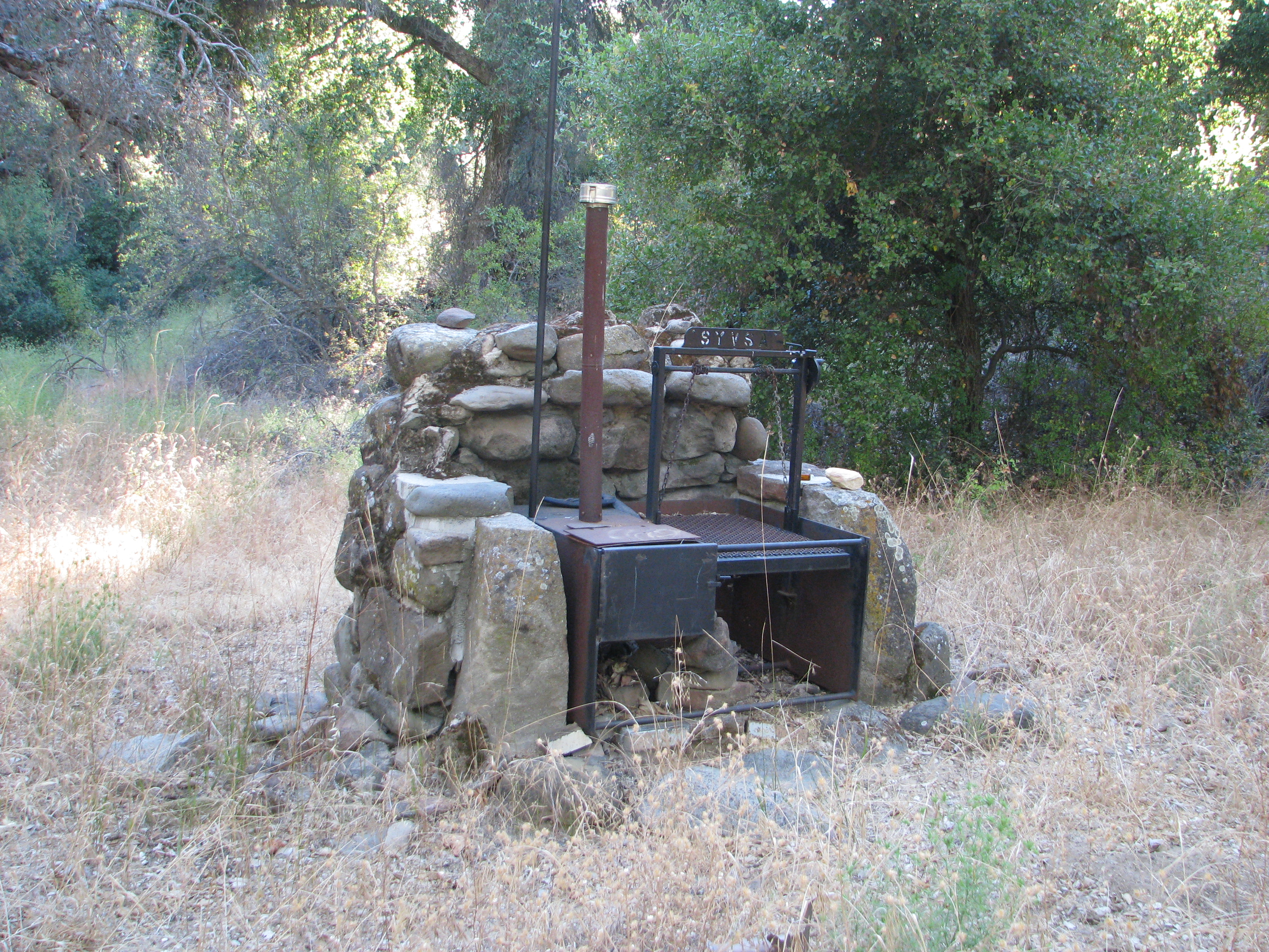 About a mile from the saddle the trail arrives at the signed junction for the Happy Hollow Connector Trail. Just a short way past this sign the trail opens up onto a grassy hillside. It’s right at this transition that one finds the turnoff for Little Pine Spring. The trail is marked, but is easy to miss and the trail itself is indistinct as it follows the edge between the grass and chaparral, threading its way through wild mustard before turning and heading down to Little Pine Spring. At Little Pine Spring you will find a picnic table, fire ring, shade and water. The Santa Cruz Trail then continues becoming even more overgrown until arriving at what is affectionately known as the 40-mile wall. Here the trail follows the contour of the mountain for the next 2 plus miles as it descends towards the Santa Cruz Creek, the trail at times can seem never ending especially on the hike out. The trail then rounds this mountain and descends down to Santa Cruz Creek and the welcome sound of running water. At Santa Cruz Camp, there are 4 campsites each with tables and fire rings and good water the length of the creek thanks to the rain we’ve had this year. At Santa Cruz Camp one can also find the fireplace that remains from the cabin built by Edward W. Alexander, who at one time owned Rancho Oso in the early 1900s and was also one of the founding members of the Los Rancheros Visitadores. Alexander is credited with introducing tourism to the Santa Ynez River area and used to offer hunting retreats. The E. W. Ranch, as it was called also used to run cattle. The fireplace has since been adapted to house a barbecue grill. From Santa Cruz Camp there are several day hiking opportunities. Further up along the Santa Cruz Trail is Flores Flats, which at one time was owned by Carlos Flores whose brother, Jose Flores, owned the Flores Flats along Gibraltar Road. And it was Jose’s son, Leo Flores who later worked as a vaquero and foreman for the E. W. Ranch. At one time Santa Cruz Camp was also a prime destination for fishing, the creek with its many pools was an ideal place to find rainbow trout, but the overall decline of the steelhead and the silt and ash from the Zaca Fire have reduced their numbers. Nevertheless I did see a couple of good size trout and fair number of small fry. From Santa Cruz Camp one can also hike up the creek to picturesque Santa Cruz Falls, about two miles round trip. Regardless of how far you go you will get see some of the rugged beauty of our Santa Barbara backcounty.