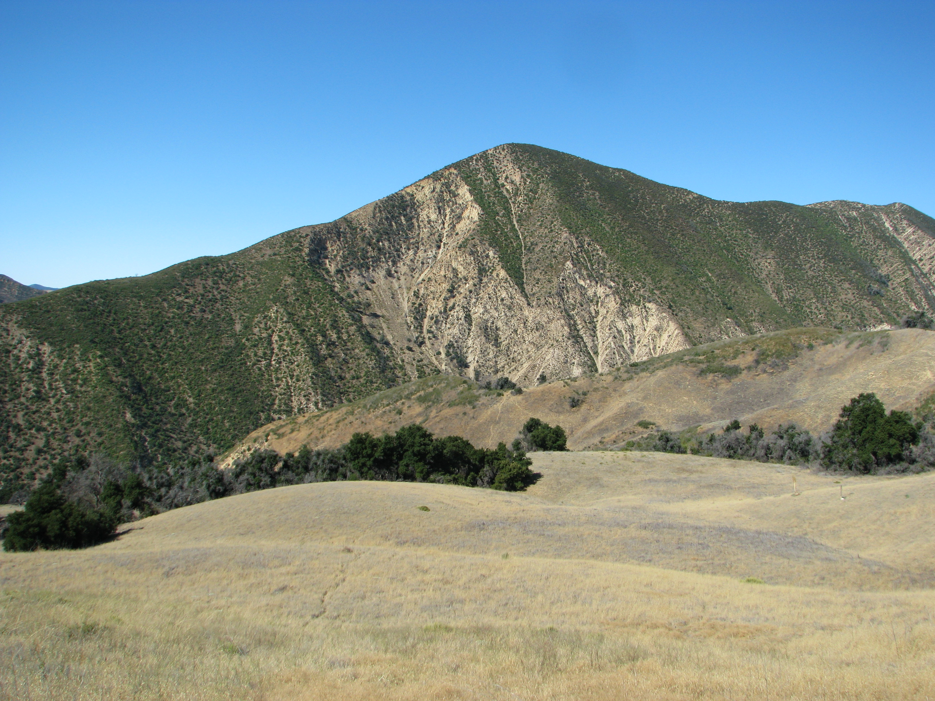 At about the 2 mile mark the Santa Cruz Trail arrives at the turnoff for Nineteen Oaks. Nineteen Oaks has two campsites under the oak trees each with a picnic table and fire ring and makes for a great destination for camping or picnicking. Water for Nineteen Oaks can often be found nearby at Oso Creek. Currently the creek is running intermittently, but there is still cool, clear water flowing near the turnoff to camp thanks to this year’s rain. From here the trail leaves the creek and begins its ascent towards Little Pine Mountain, transitioning out of riparian plants and into wild grasses and chaparral. The hike to the saddle is challenging but arriving at the top brings with it both a sense of accomplishment and great views in just about every direction. From the saddle the Santa Cruz Trail continues down the backside of the mountain and becomes noticeably more overgrown in comparison to the hike so far. This is both a reflection of the regrowth from 2007 Zaca Fire, the southern edge of which burned to just past the saddle, and the lack of funds available for ongoing trail maintenance.