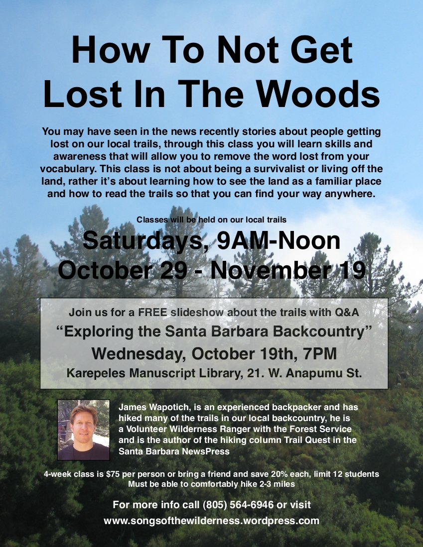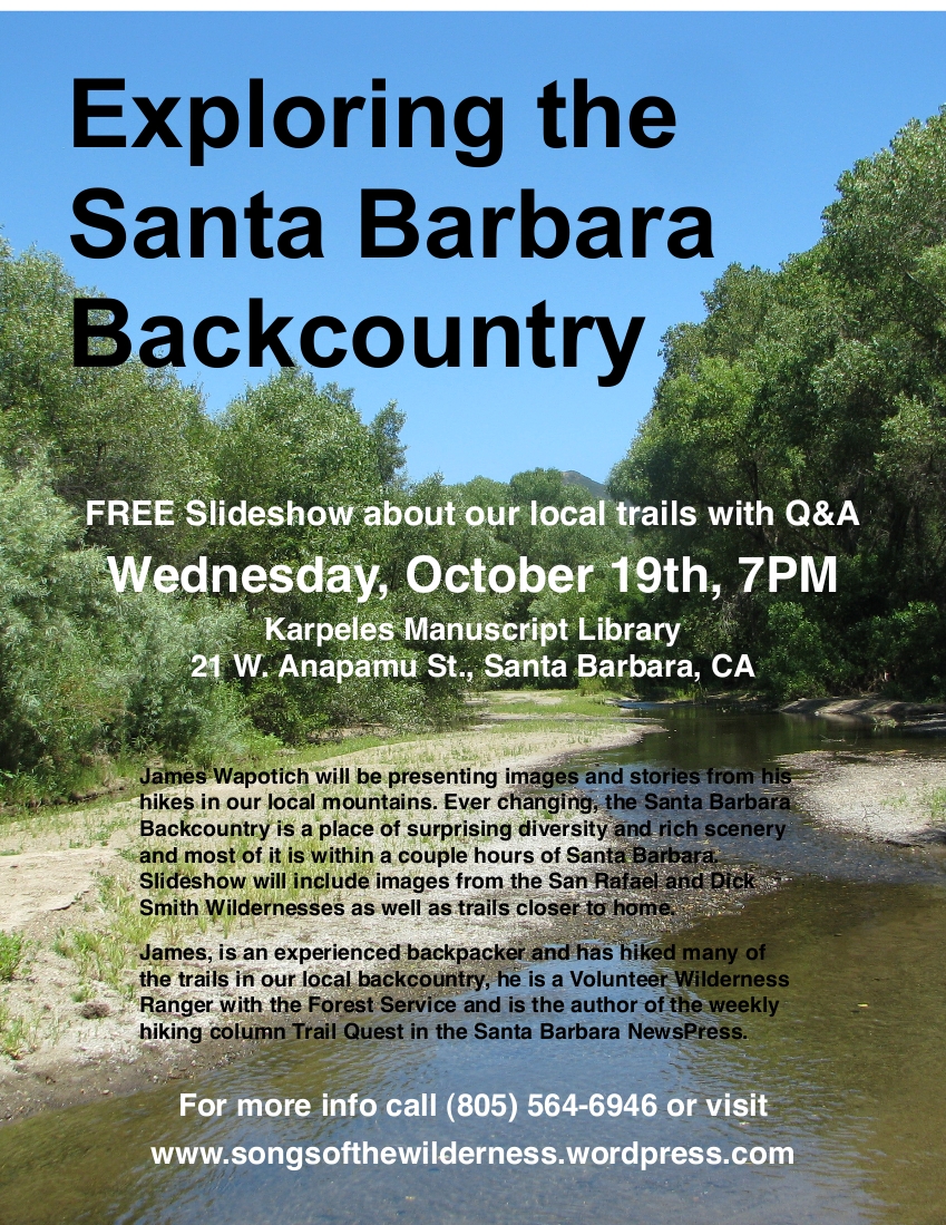 As introduction there will be a FREE slideshow presentation “Exploring the Santa Barbara Backcountry”. James Wapotich will be presenting images and stories from his hikes in our local mountains. Ever changing, the Santa Barbara Backcountry is a place of surprising diversity and rich scenery and most of it is within a couple hours of Santa Barbara. Slideshow will include images from the San Rafael and Dick Smith Wildernesses as well as trails closer to home and will be held at the Karpeles Manuscript Library, Wednesday, October 19th at 7PM, 21. W. Anapamu St. in Santa Barbara.