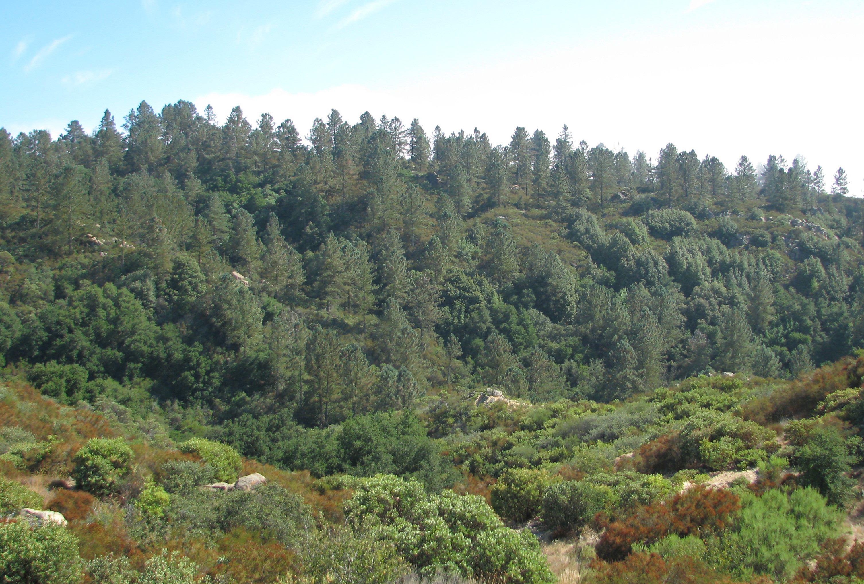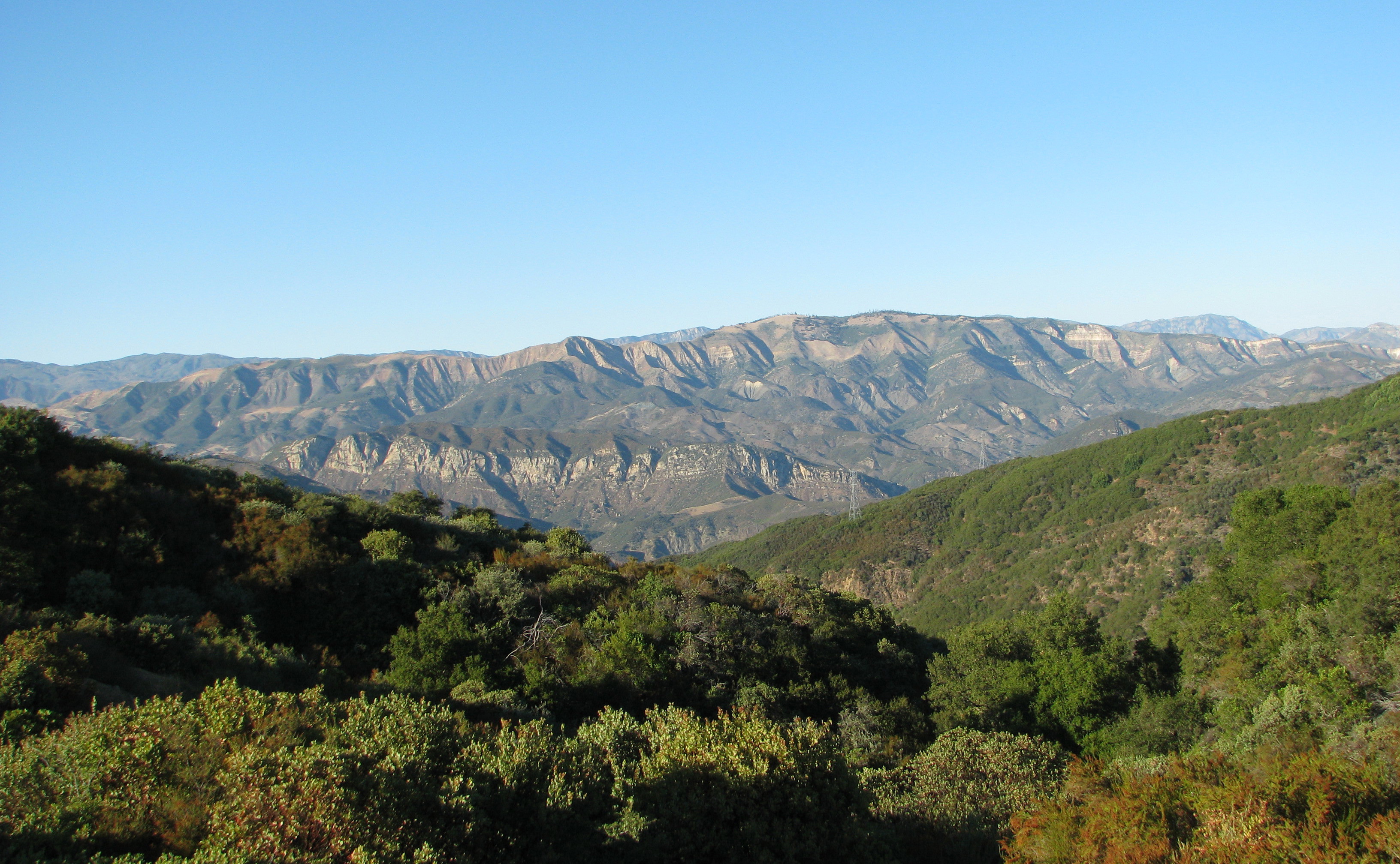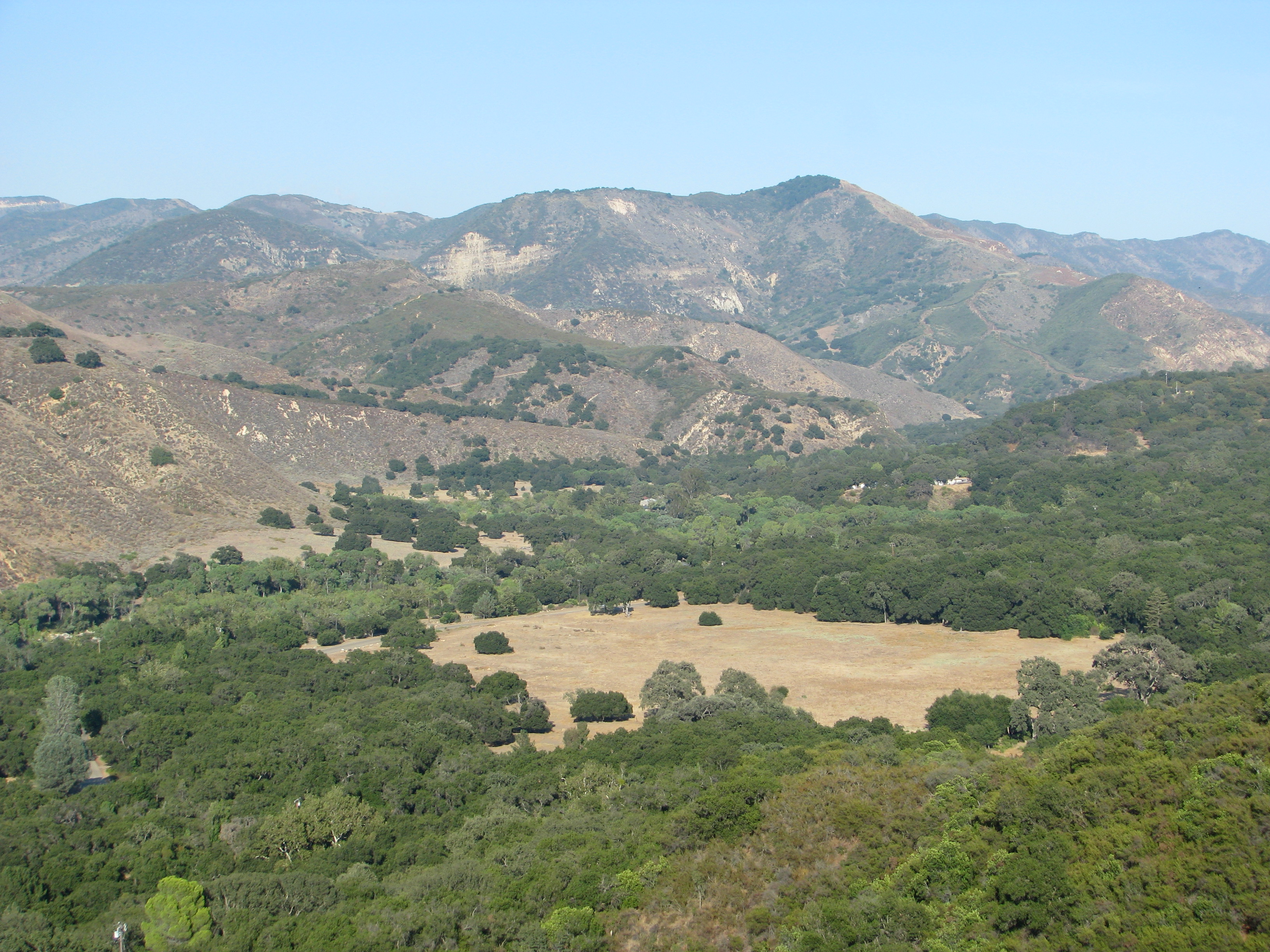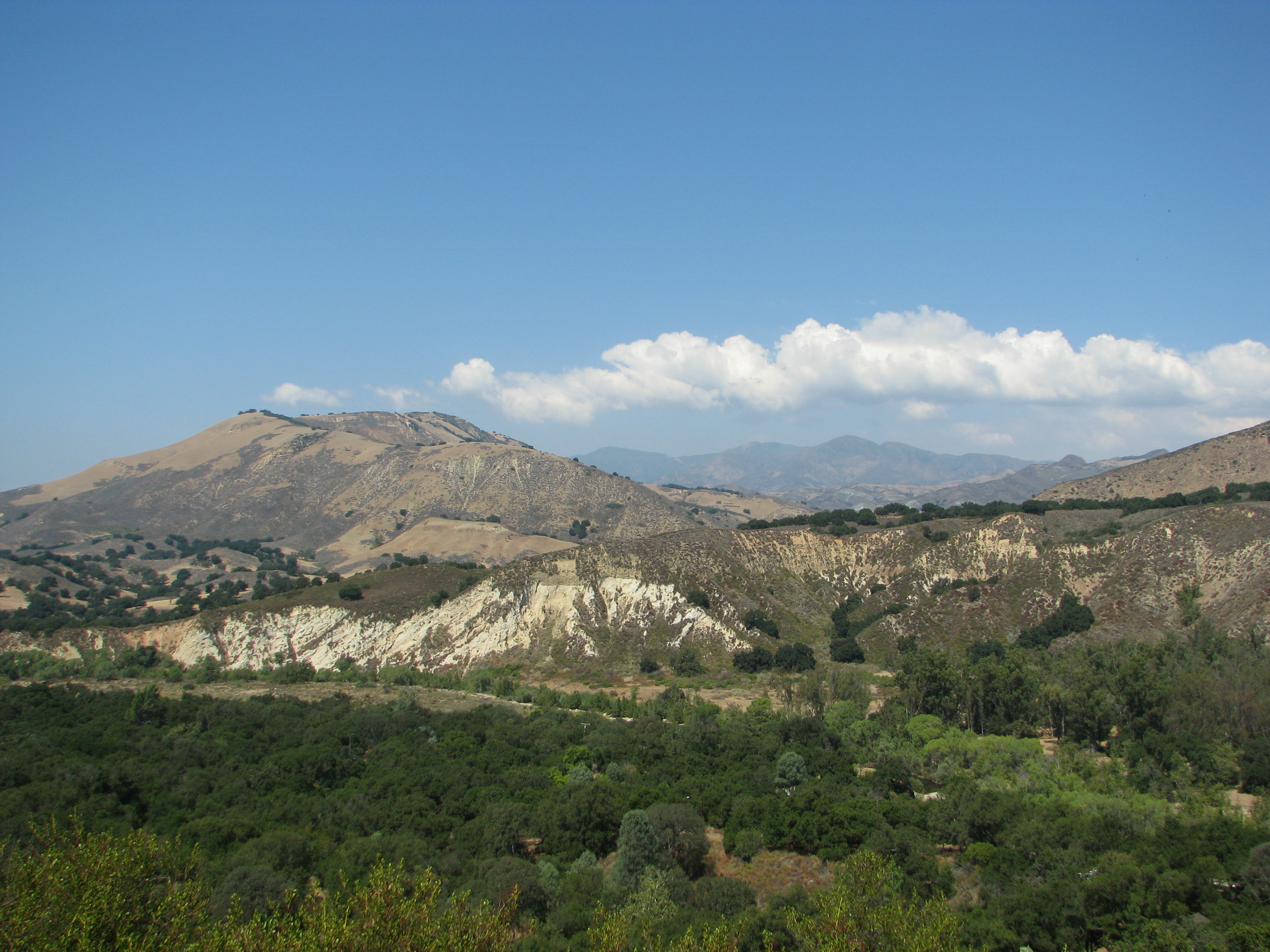 From here the trail continues down through the canyon, following the dry creek bed until it crosses the creek and begins to follow the low ridge that defines the southern edge of the canyon. The trail along the ridge is somewhat overgrown threading through mostly ceanothus but is still followable and where it does open up offers some unique views of the surrounding hills and mountains that one would see driving along Paradise Road.