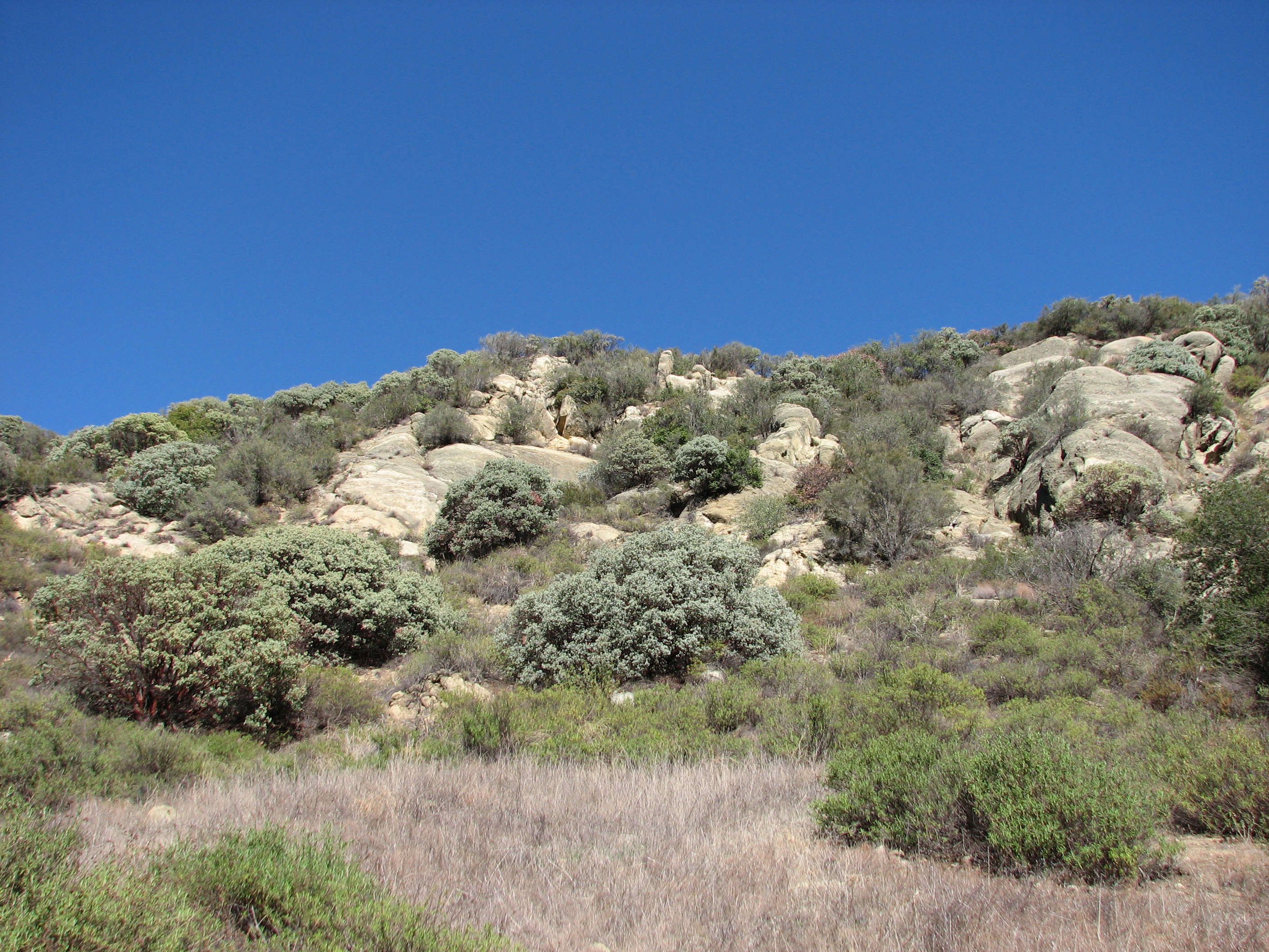 The Cold Springs Trail down to Forbush Flats is one of the nicer hikes one will find. The trail is generally well maintained, but sees far fewer visitors than on the front country side. The trail descends from East Camino Cielo through Gidney Canyon and can bring with it a sense of discovery. Being on the northern facing side of the mountains, the canyon supports a wide variety of chaparral plants including ceanothus, manzanita, scrub oak, bay laurel, and toyon, which further add to the feeling of venturing into the backcountry. At about the one mile mark the trail briefly follows the contour of the ridge between Gidney and Forbush Canyons and provides some excellent views of the surrounding area. In addition to the San Rafael Mountains in the distance, from this vantage one can gaze across the length of Blue Canyon as it stretches eastward, and even make out the blue waters of Jameson Lake and beyond that Divide Peak. Blue Canyon takes its name from the blue-green serpentine rock outcroppings that can be seen from here, and one can also see the large grassy meadow at the western end of Blue Canyon where Cottam Camp is located.
