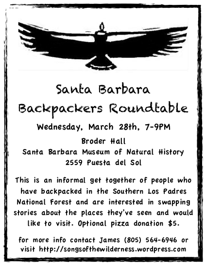 I’ll be hosting a Backpackers’ Roundtable, Wednesday, March 28th, 7-9PM at Broder Hall at the Santa Barbara Museum of Natural History.
