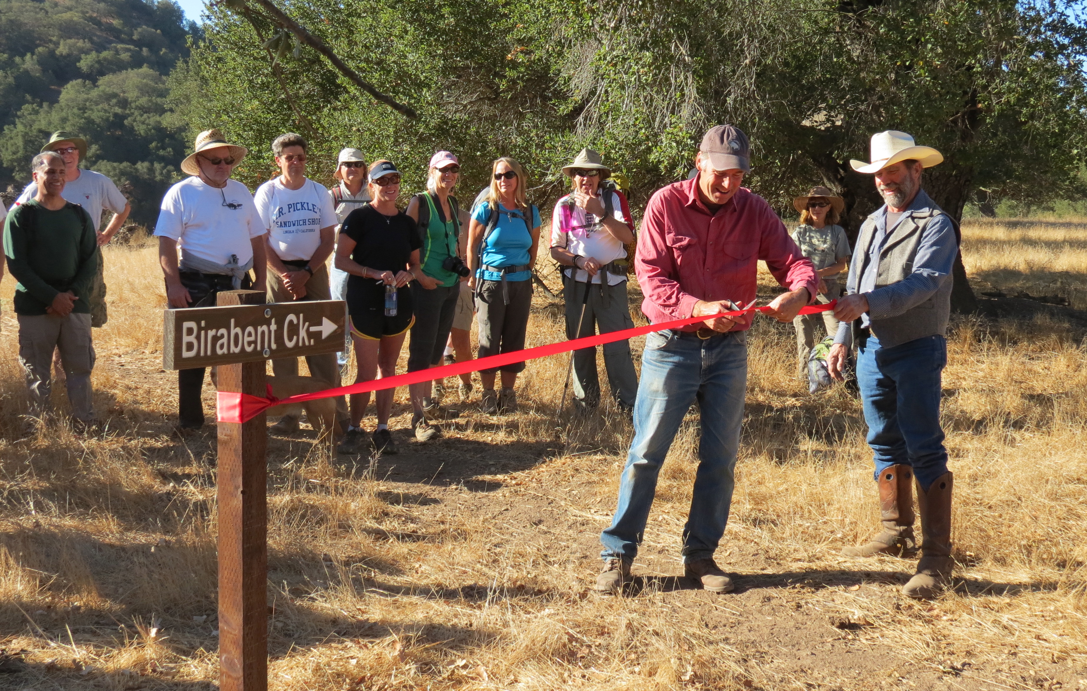 Midland School Ranch Manager Ben Munger cuts the ribbon officially opening the Midland Trail while Otis Calef, Santa Barbara Trails Council President, looks on with other hikers gathered for the event.