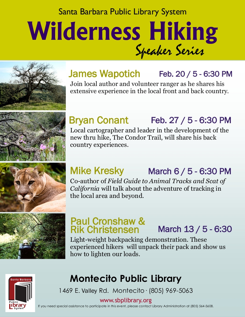 The Montecito Public Library is hosting an exciting line up of speakers in February and March. The talks are free and are on Wednesdays from 5:00-6:30PM and are an excellent opportunity to learn more about visiting our local backcountry.