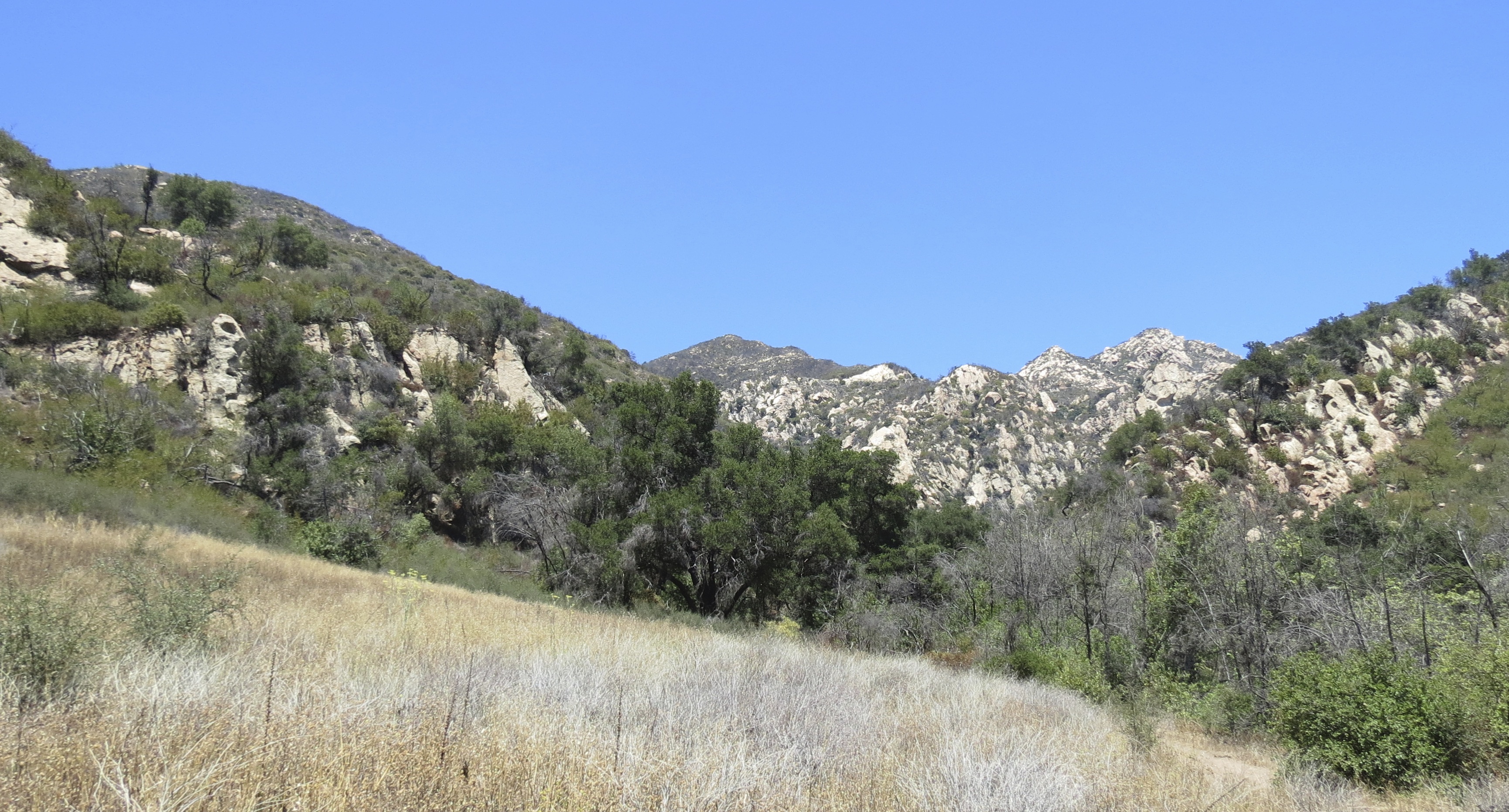 As the trail continues past the grove of pines, it climbs away from the creek offering views back down the canyon. The trail then crosses the creek a second time.