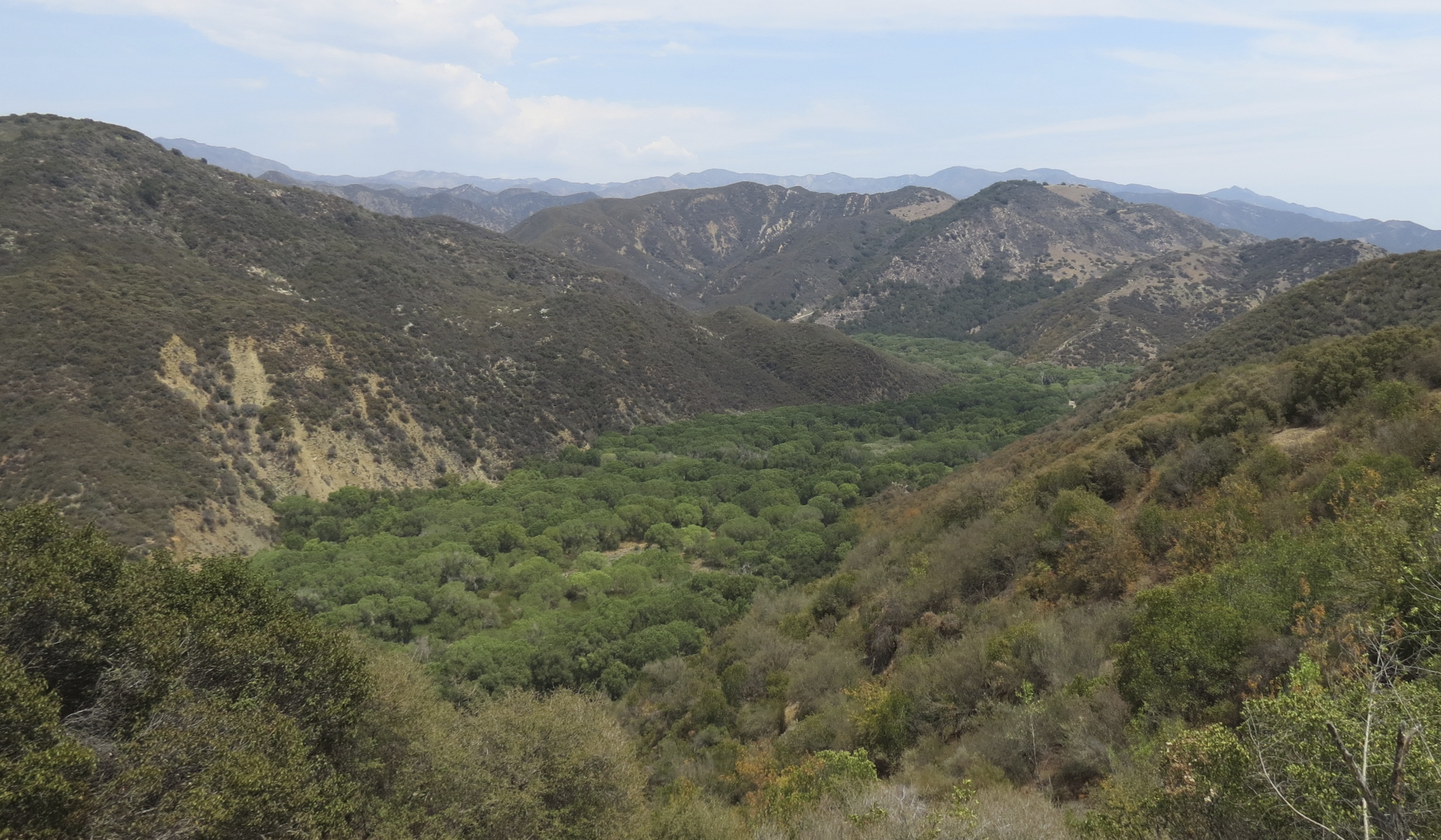 Gibraltar Trail continues to the west. The trail climbs out of the canyon and parallels the Santa Ynez River, offering great views of the confluence of the Santa Ynez River and Mono Creek, as well as the Mono Jungle. Both are marked by a dense growth of cottonwood trees.