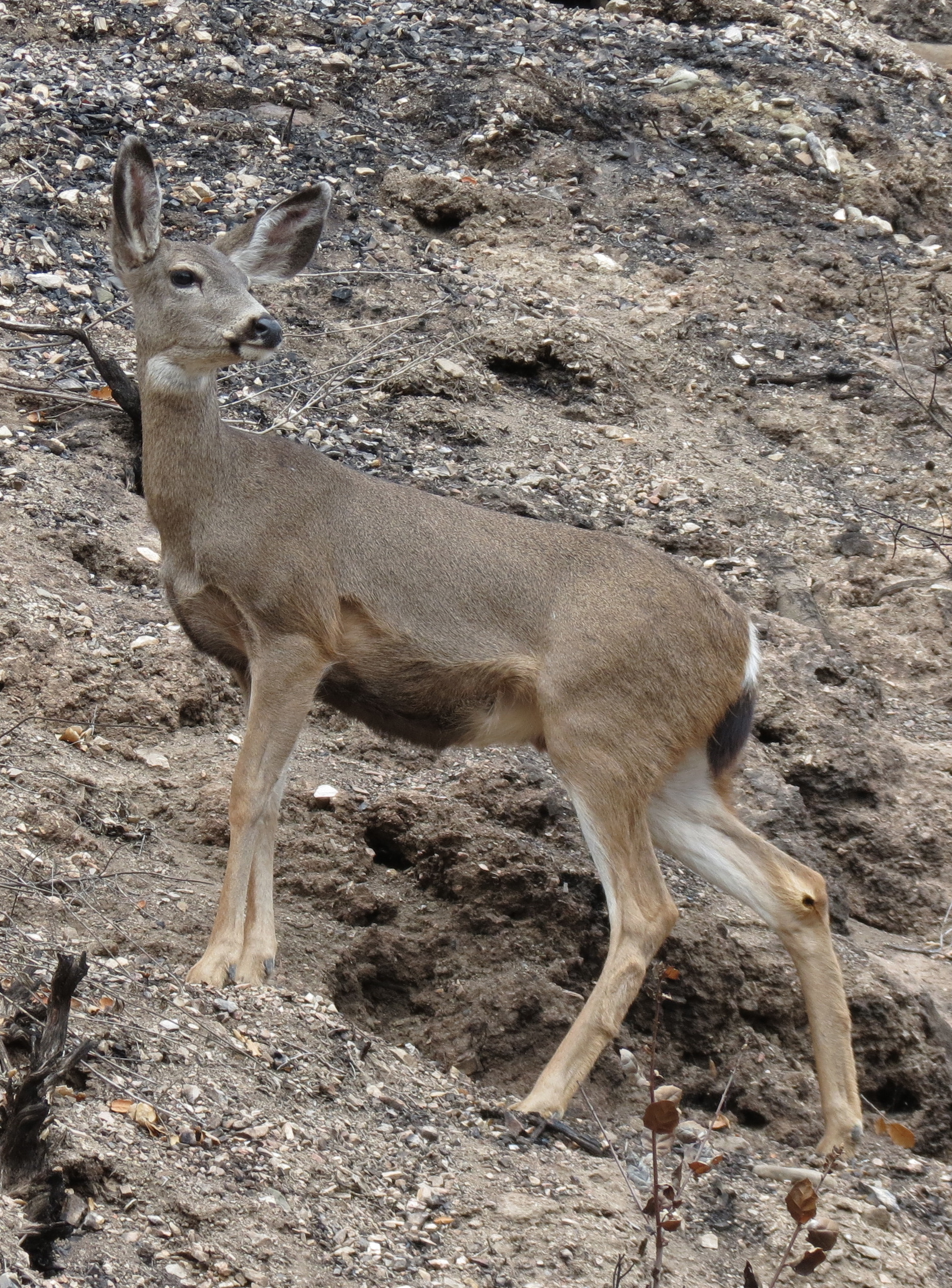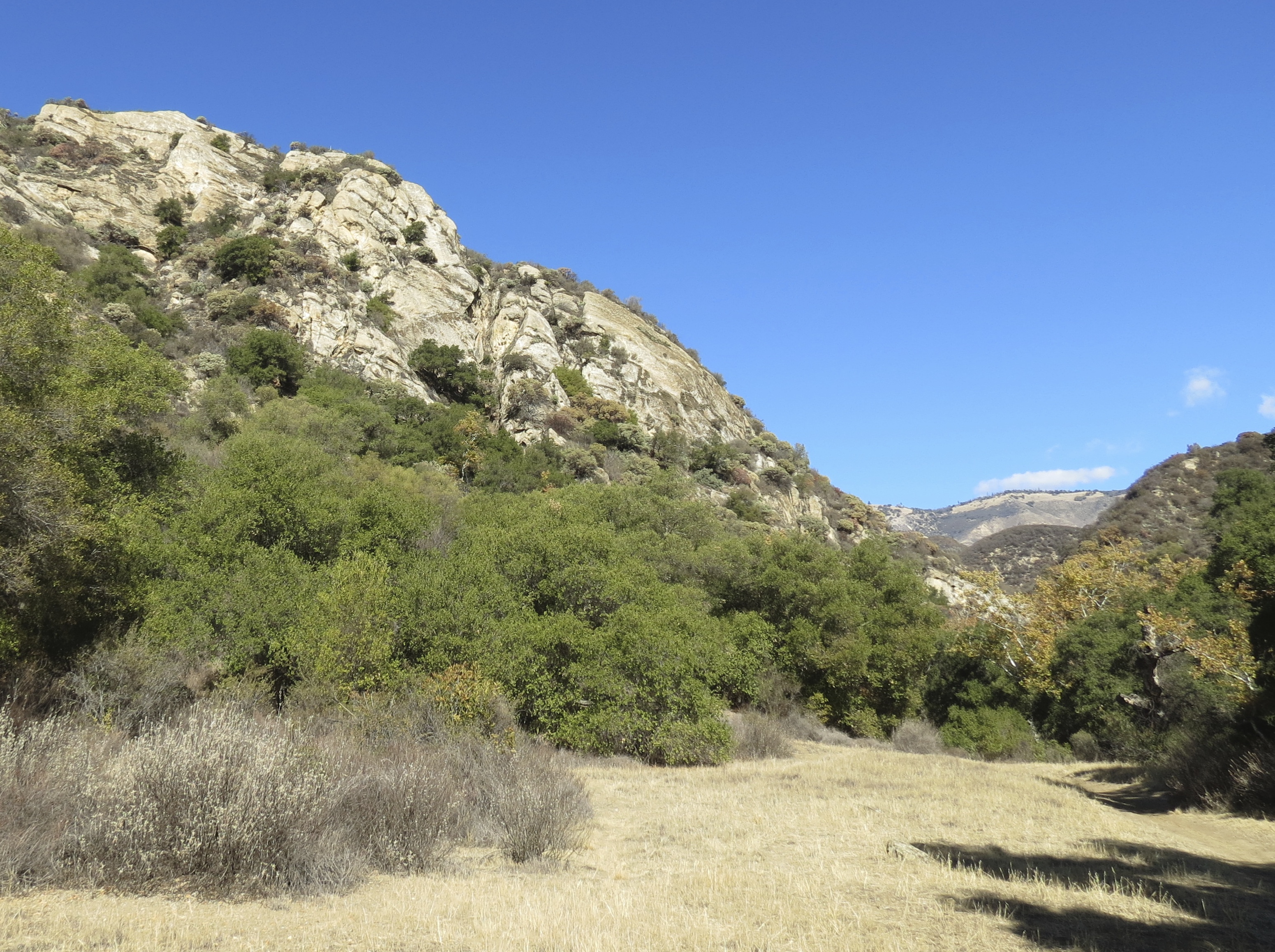 Shortly after leaving Lower Oso, the trail crosses Camuesa Road and continues through the broad open canyon, staying to the west of the road all the way to Upper Oso. Prior to the fire the trail passed through what was mostly grassland dotted with coast live oak. And while the views are still framed by the surrounding hillsides, it will likely take the return of the grasses in the spring for the area to become more picturesque.