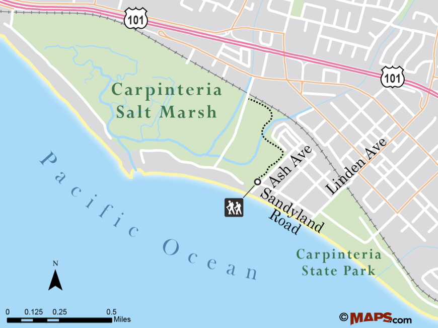 To get to the park from Santa Barbara, take Highway 101 south to the Linden Avenue exit. Continue south on Linden Avenue to Sandyland Road, which is the last street before Linden Avenue ends. Turn right onto Sandyland Road, which dead ends into Ash Street and the main park entrance. Parking is found along the street, and coastal access can be found at the end of both Linden Avenue and Ash Street.