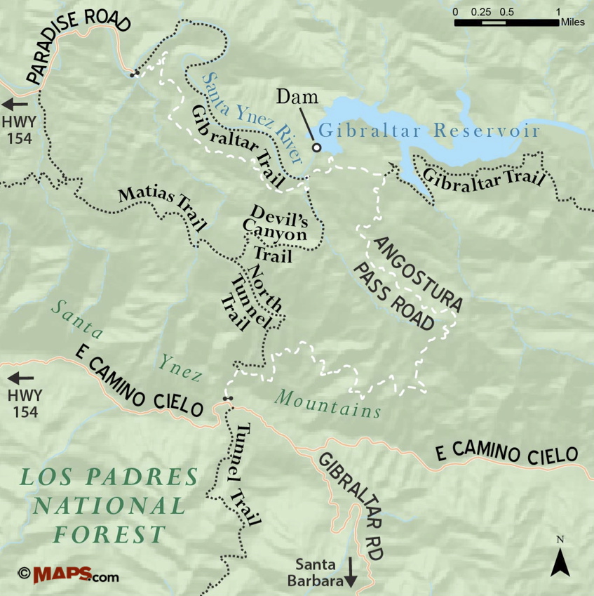 Both the unpaved access road and Gibraltar Trail represent alternate routes for visiting Devil’s Canyon. That is, one can take State Route 154 from Santa Barbara, continue over San Marcos Pass to Paradise Road, and then follow Paradise Road to Red Rock Trailhead. From Red Rock trailhead one can follow either the access road or the trail as the two meet up a half mile from the dam.