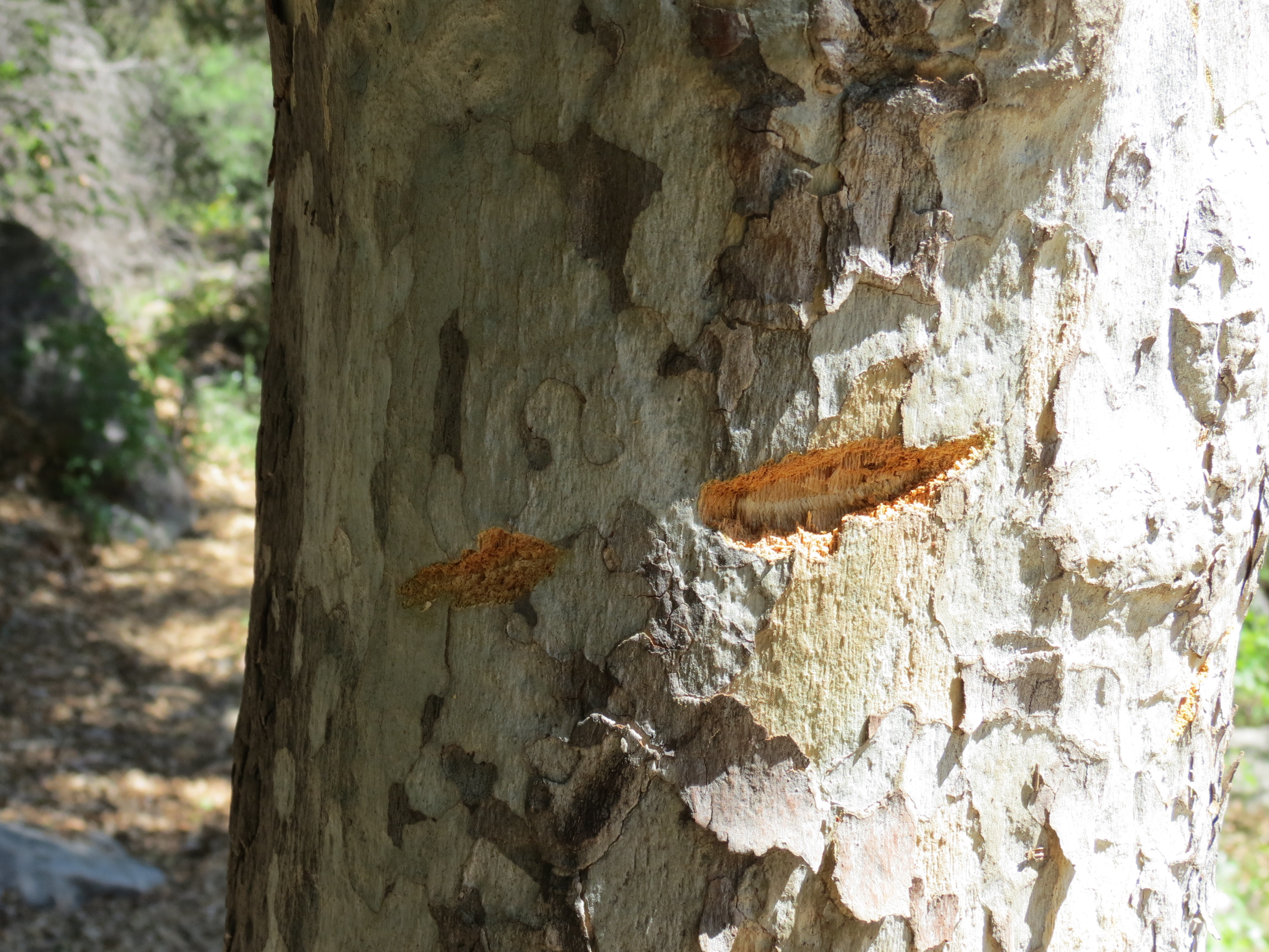 It’s also here that one starts to find bear sign on the trees, that is places where bears have scratched and bitten the trees, in this case sycamore. Bears tend to mark and rub on trees along their travel routes, and are said to select trees, such as alder and sycamore for the high contrast the marks make, or pine for the scent that is activated.