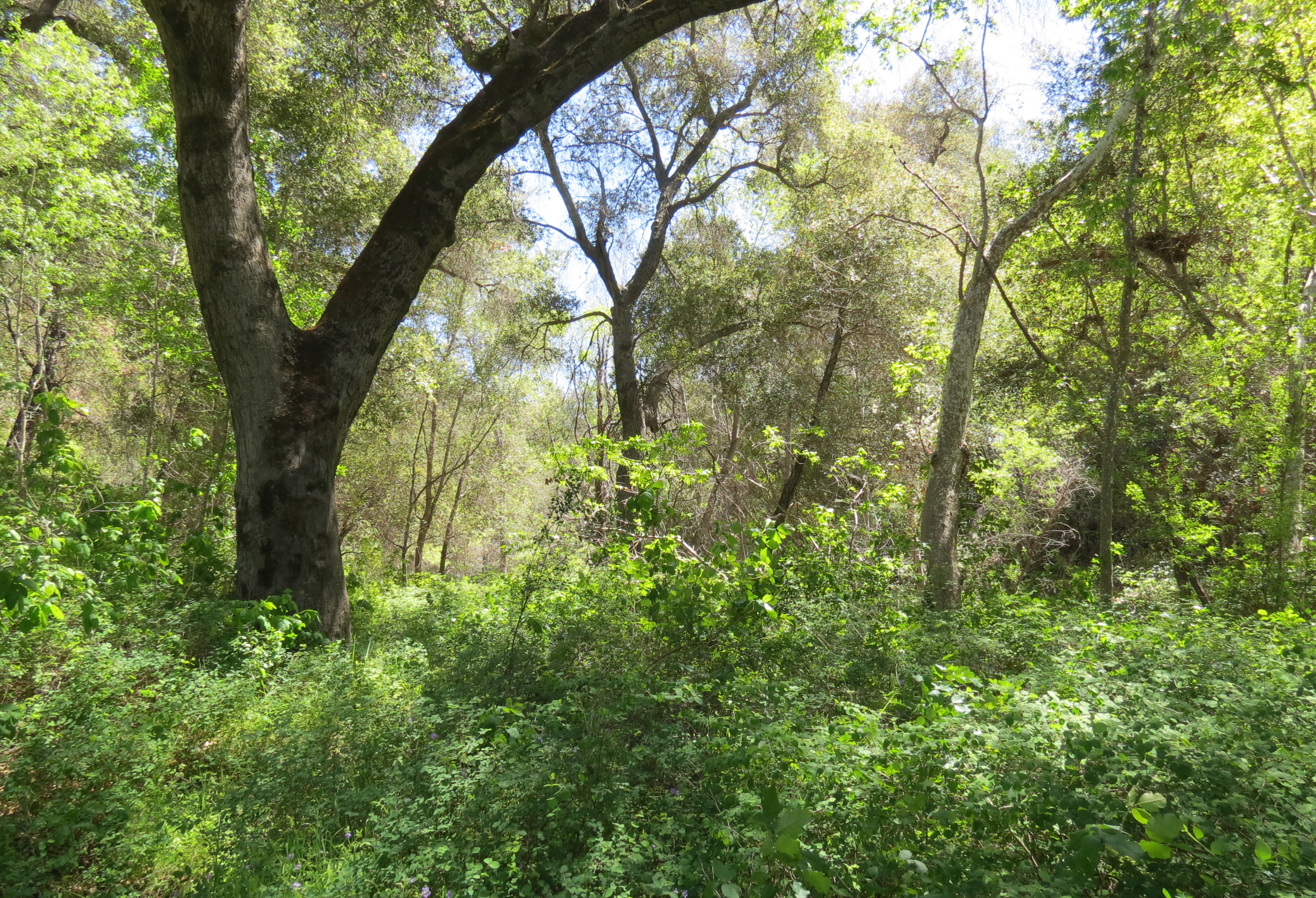 The trail starts off mostly shaded, and where it crosses several dry side creeks one can find bay laurel and maple trees. Along the trail are also two small stands of madrone trees, remnants from a time when Southern California was a much wetter region, more akin to how Northern California is now. With its red bark, madrone can be mistaken for manzanita, which grows as more of a low shrub or tree.