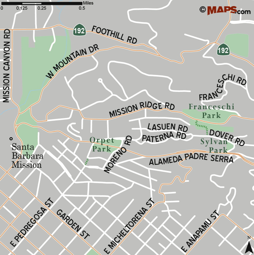 Pedregosa Street is one block south of Mission Street, which can be reached from Highway 101 by taking the Mission Street exit and continuing north towards the Santa Barbara Mission. From Mission Street turn right onto Garden Street to reach Pedregosa Street, and continue to the end of Pedregosa Street. Parking can be found along the residential streets.