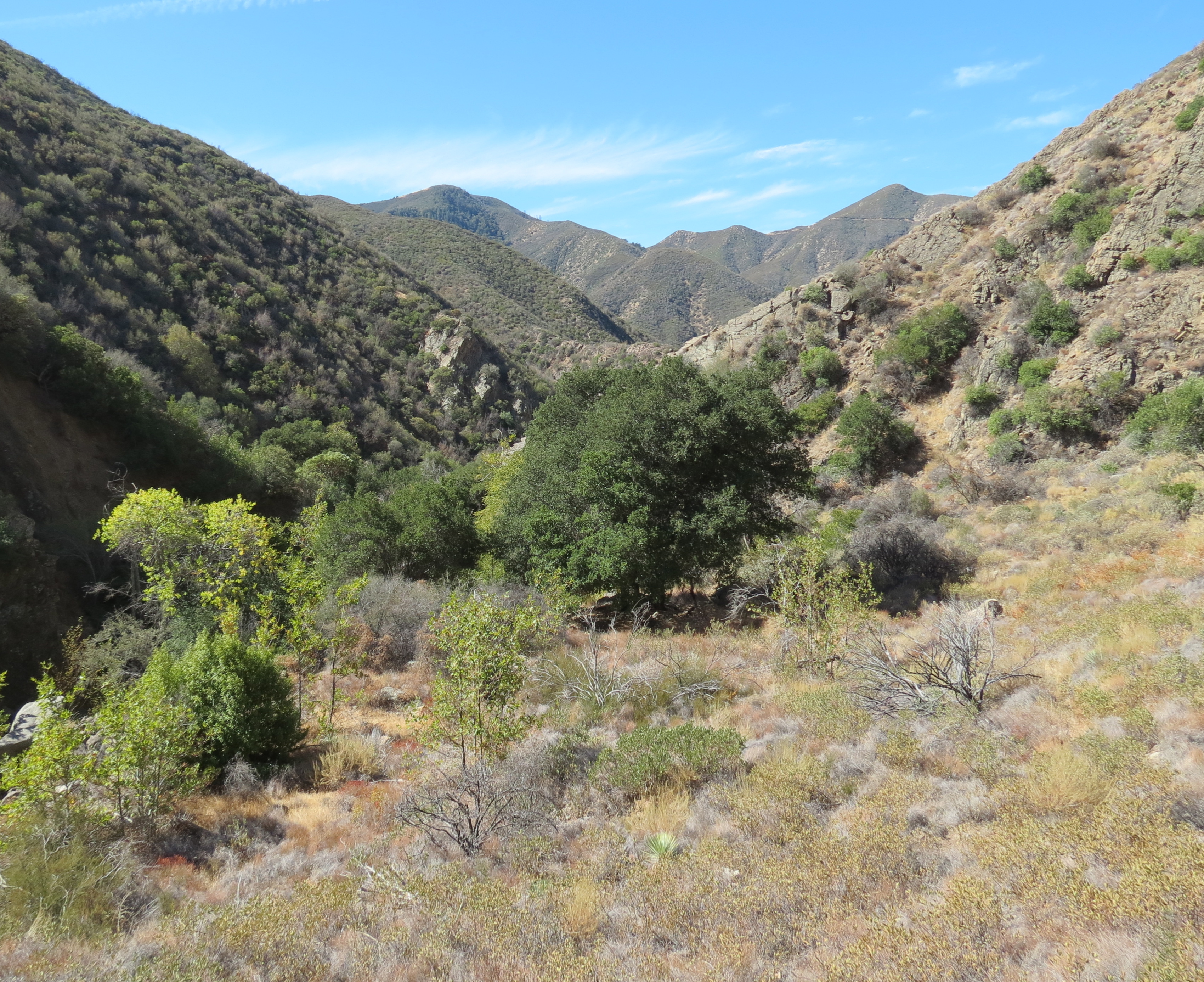 Both the trail and camp take their name from the big cone spruce that grow along the canyon. The trail is more overgrown than Manzana Trail, but is still followable. Currently there is water flowing intermittently in the creek, and near the camp.