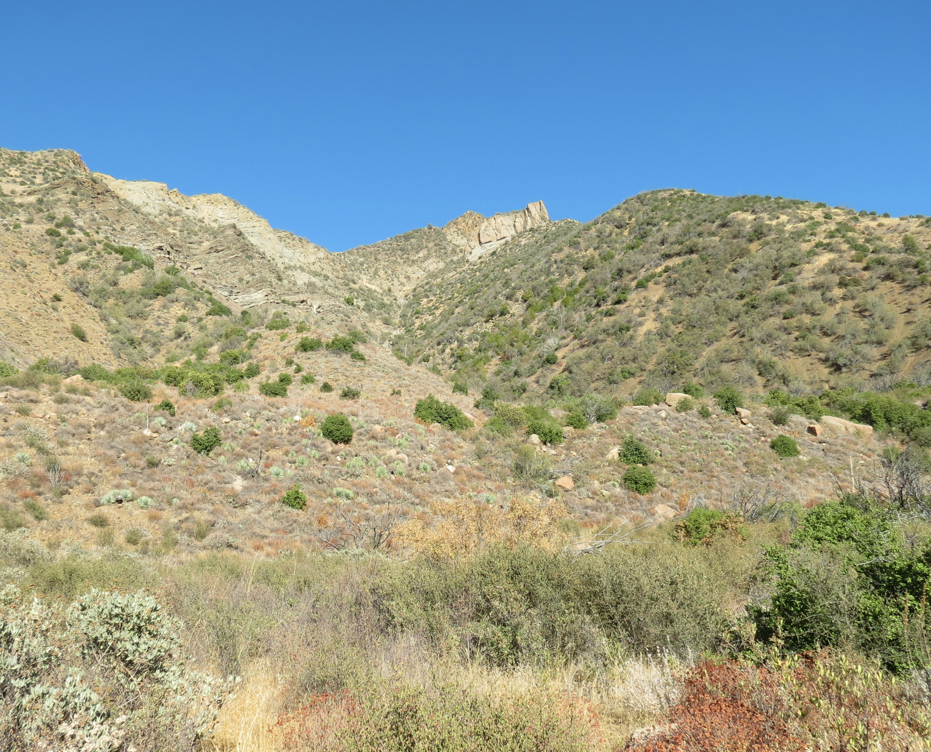 Just past the turnoff to the second campsite, Big Cone Spruce Trail crosses the creek one last time, before starting its 1.25-mile climb towards to the top of the San Rafael Mountains and McKinley Fire Road. The trail quickly leaves the shady confines of the canyon and continues through the more exposed chaparral. The trail is steep, but does offer views to the east of San Rafael Mountain and the headwaters of Manzana Creek, and to the north, views of Hurricane Deck and Sierra Madre Mountains.