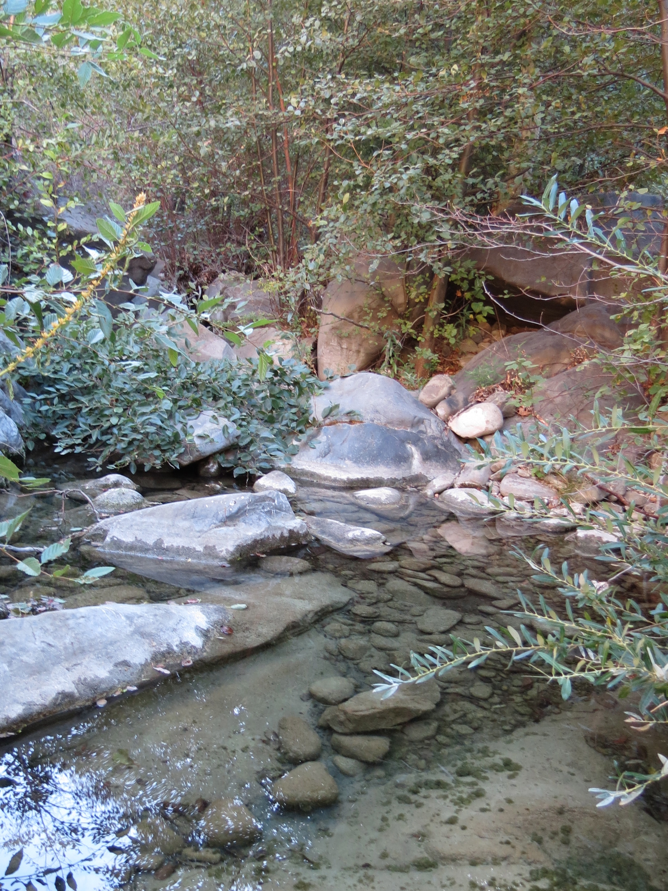The trail then climbs above the creek, and continues through chaparral before returning down to the creek and arriving at Fish Camp. The camp is about 2.5 miles from Nira and is located just above the confluence of Fish Creek and Manzana Creek. In the springtime a swim hole can be found just below the confluence.