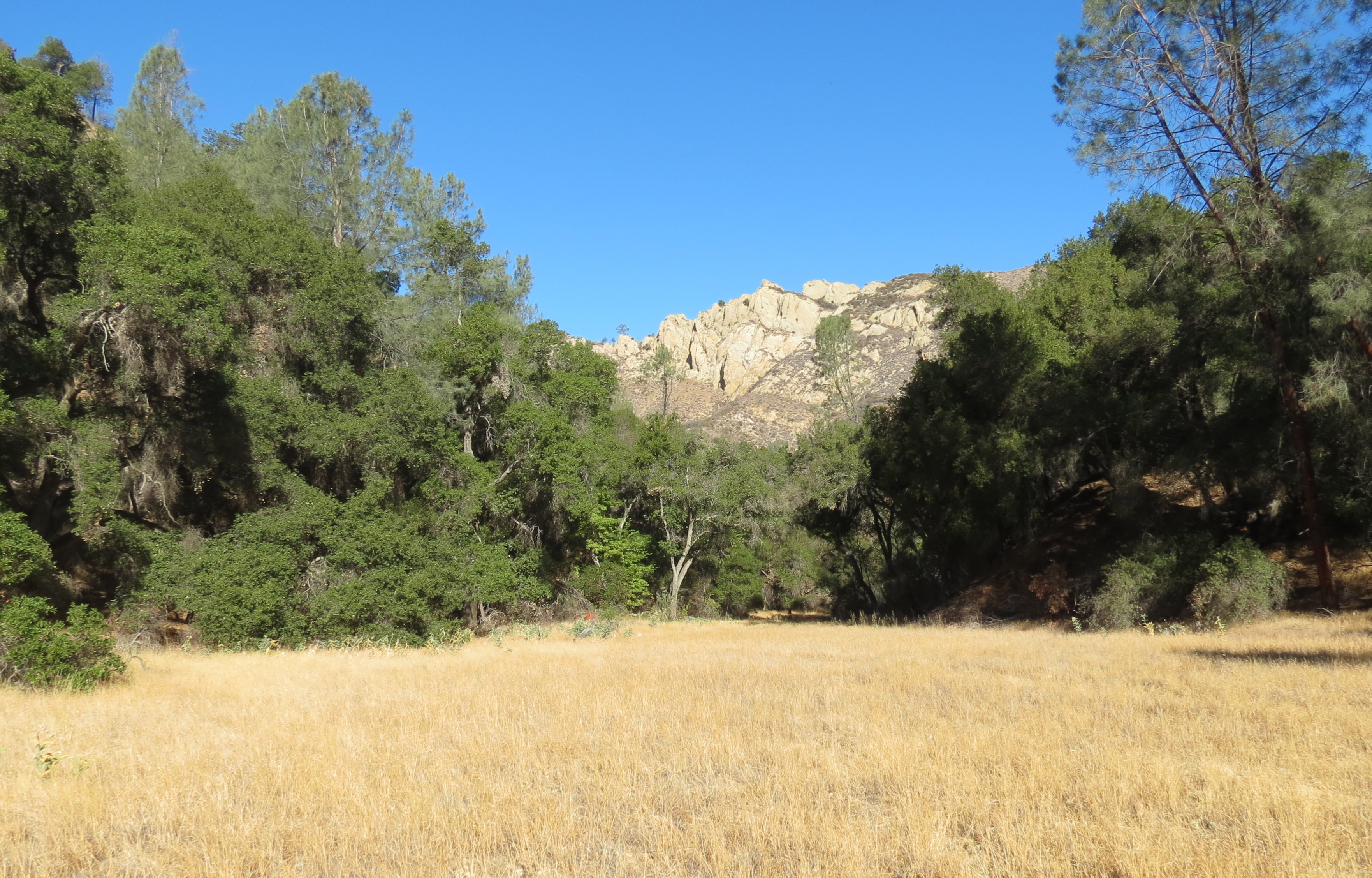 In contrast with the hike upstream from Nira, the hike downstream includes more open, grassy areas as the canyon widens on its way down towards Sisquoc River.