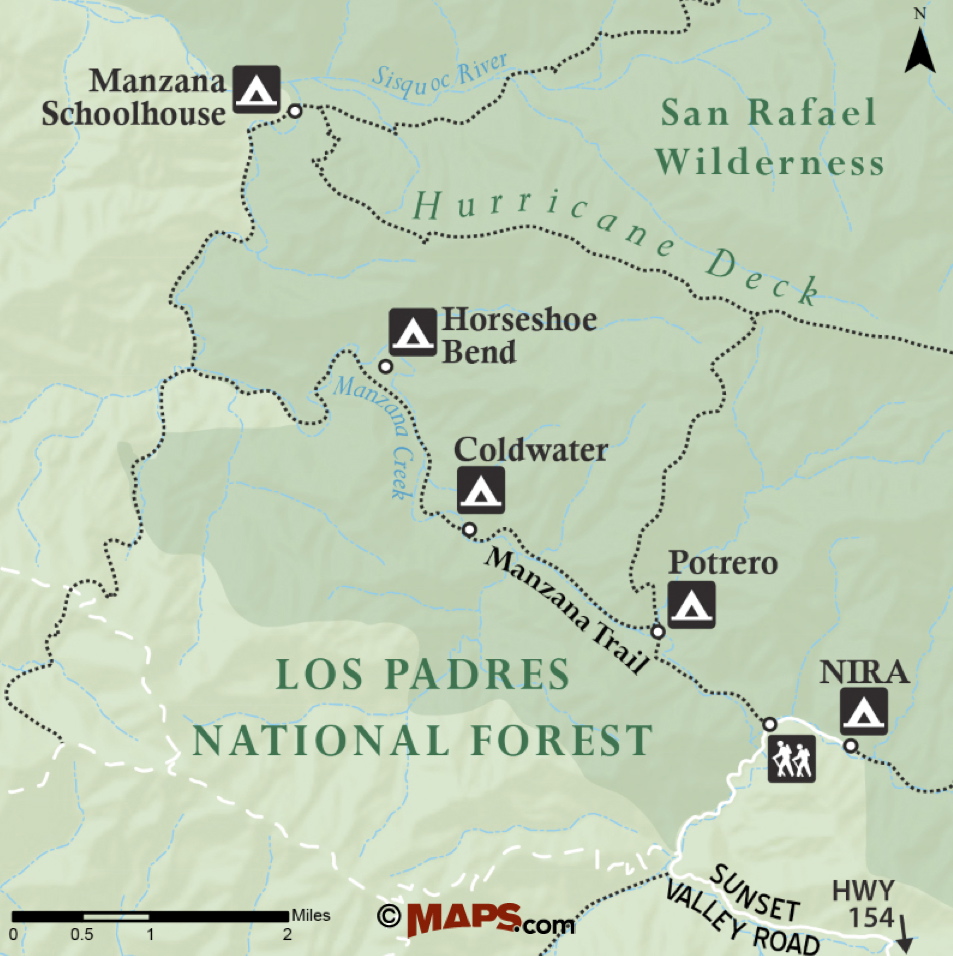 Manzana Trail then rides above Manzana Creek for the first 1.25 miles before dropping back down to the creek, and arriving at Potrero Camp. The camp has two sites both along the creek. The camp takes its name from the nearby Potrero Trail, which leads up to Hurricane Deck.