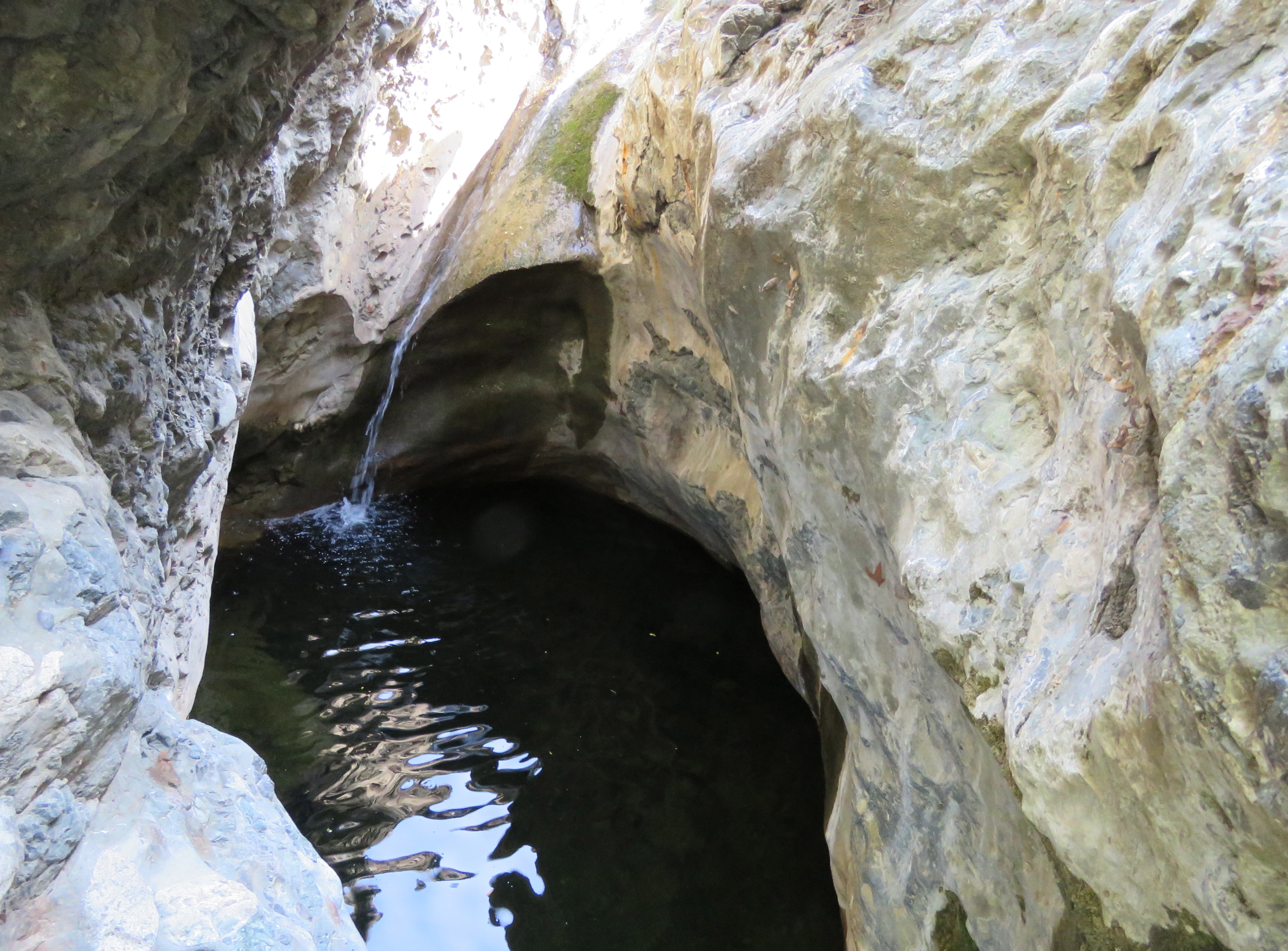 The grotto is formed where Fish Creek has carved through conglomerate stone and has created an almost hidden pool of water. The canyon’s geology represents another interesting aspect of the hike. From Nira, Manzana Trail passes through mostly Cachuma Formation shale. Cachuma Formation material was deposited 100-66 million years ago under the ocean, and then uplifted and eroded over time along with the other layers of sedimentary and metamorphic rocks in the San Rafael Mountains.