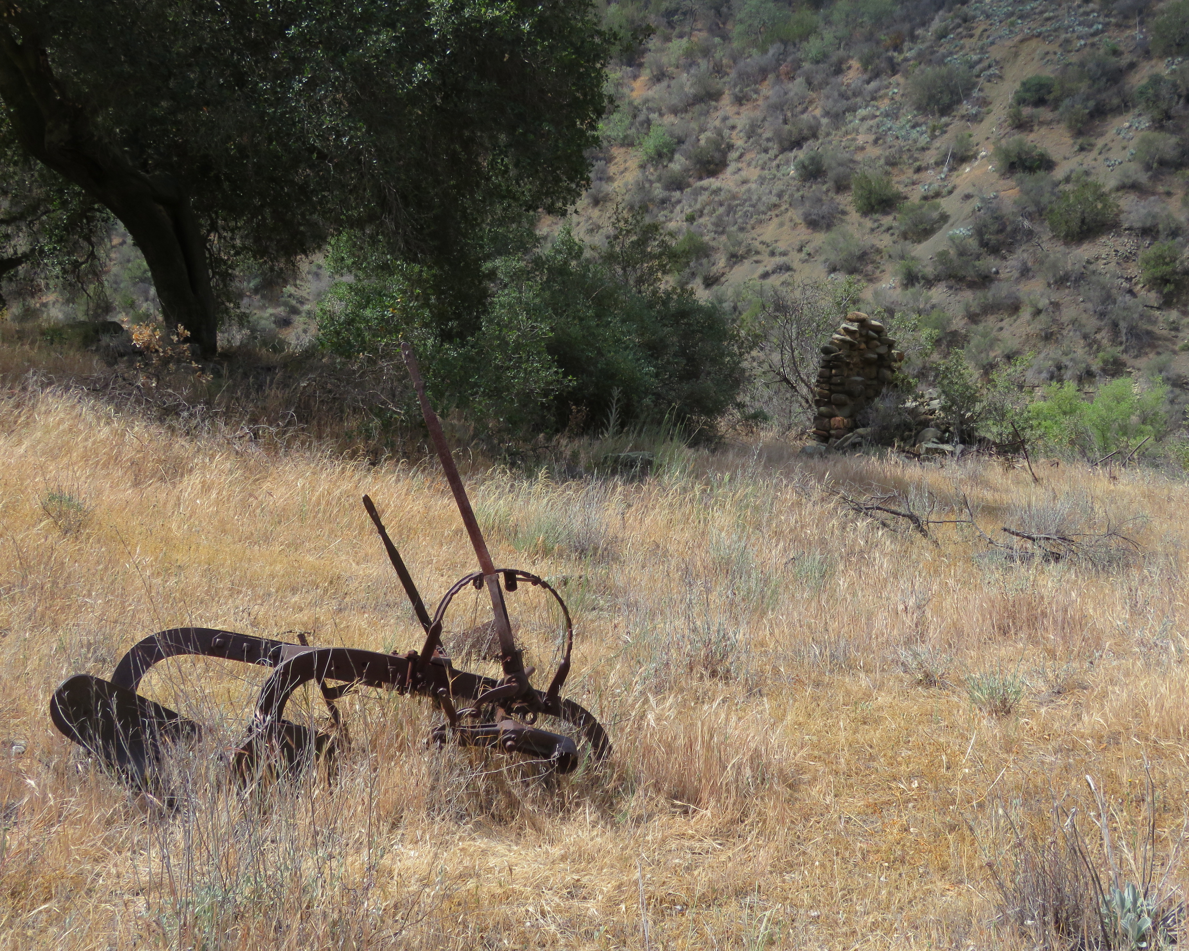 Today, what remains from the homestead is the chimney and nearby root cellar. Out in the field, by the homestead site, one can find what’s left of the well, a fair amount of corrugated metal, and some rusting farm equipment.