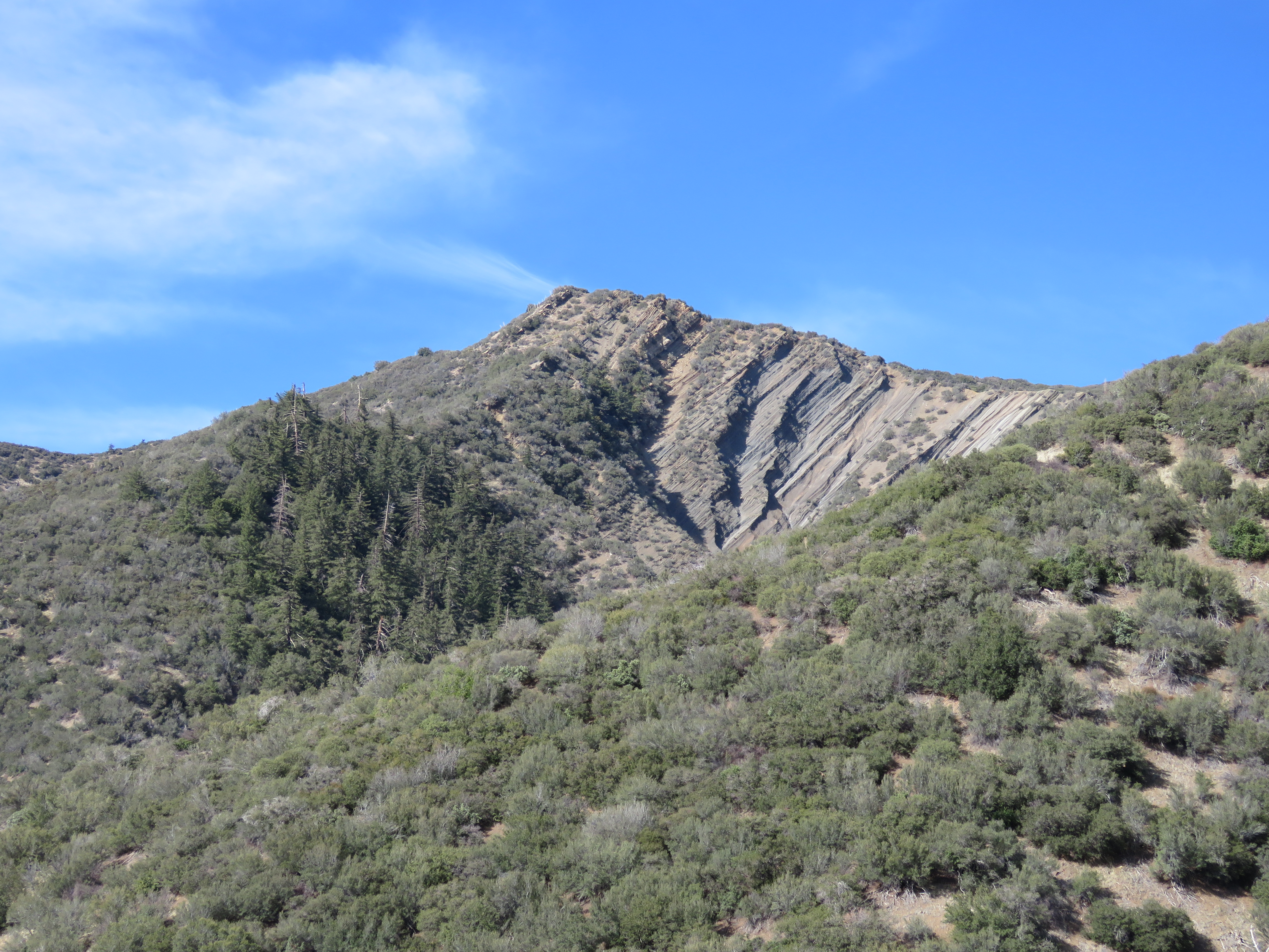 Geologically, the broad canyon where the trail juncture is located represents a transition in the landscape. And although the canyon there is filled with deposited material, running underneath it is the east-west Santa Ynez Fault, which has likely contributed to the canyon’s shape. To the south along the section of trail hiked so far, the next formation is Coldwater Sandstone; to the north, as the trail continues towards Nordhoff Ridge, it passes through an older, unnamed formation of sedimentary rock, which includes cobble conglomerate material.